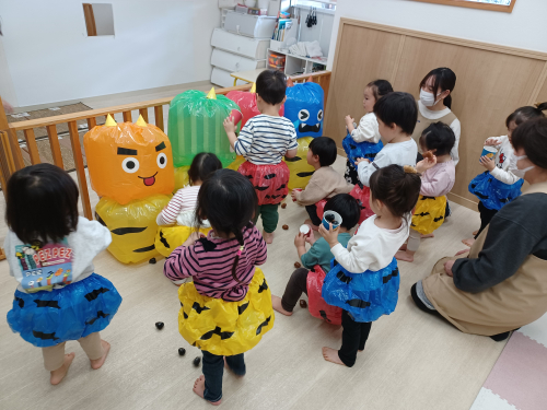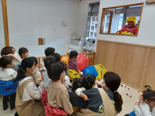 豆まきをしました⭐️ 今日は節分なので 保育園でも豆まきをしました。 泣き虫鬼、おこりんぼ鬼、 いたずら鬼、ニコニコ鬼に向かって 『鬼は外ー!福は内ー!』と言いながら 豆を投げました。 そこへ鬼が登場!! みんな初めはびっくりしてお部屋の後ろに 隠れたり先生のところに行っていましたが 鬼に向かって豆を投げていました❗ みんなの力で鬼を追い払うことが できました😊 2026年02月03日 02:13 スタッフ